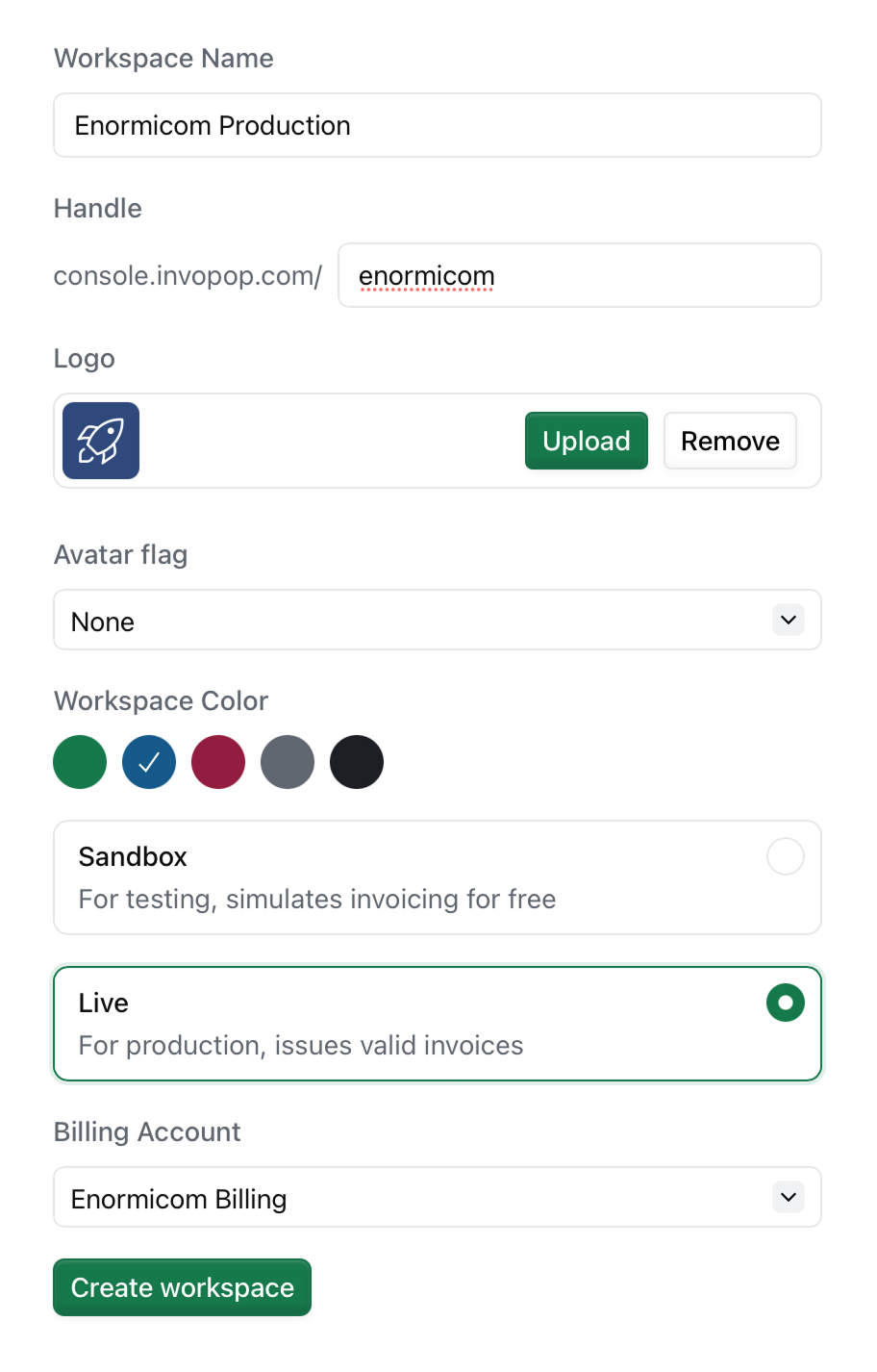 The handle determines the URL of your workspace and is used in API endpoints. It’s auto-generated from your workspace name, but you can customize it to your liking. Handles must be unique within Invopop and can only contain lowercase letters, numbers, and hyphens.Avatar flag