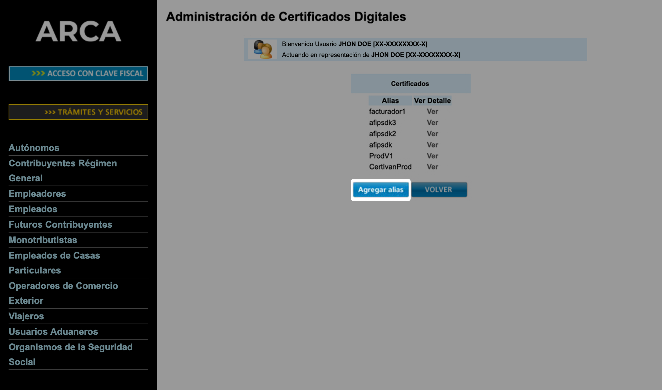 Dentro elegimos ARCA > Servicios interactivos > Administración de Certificados Digitales.
