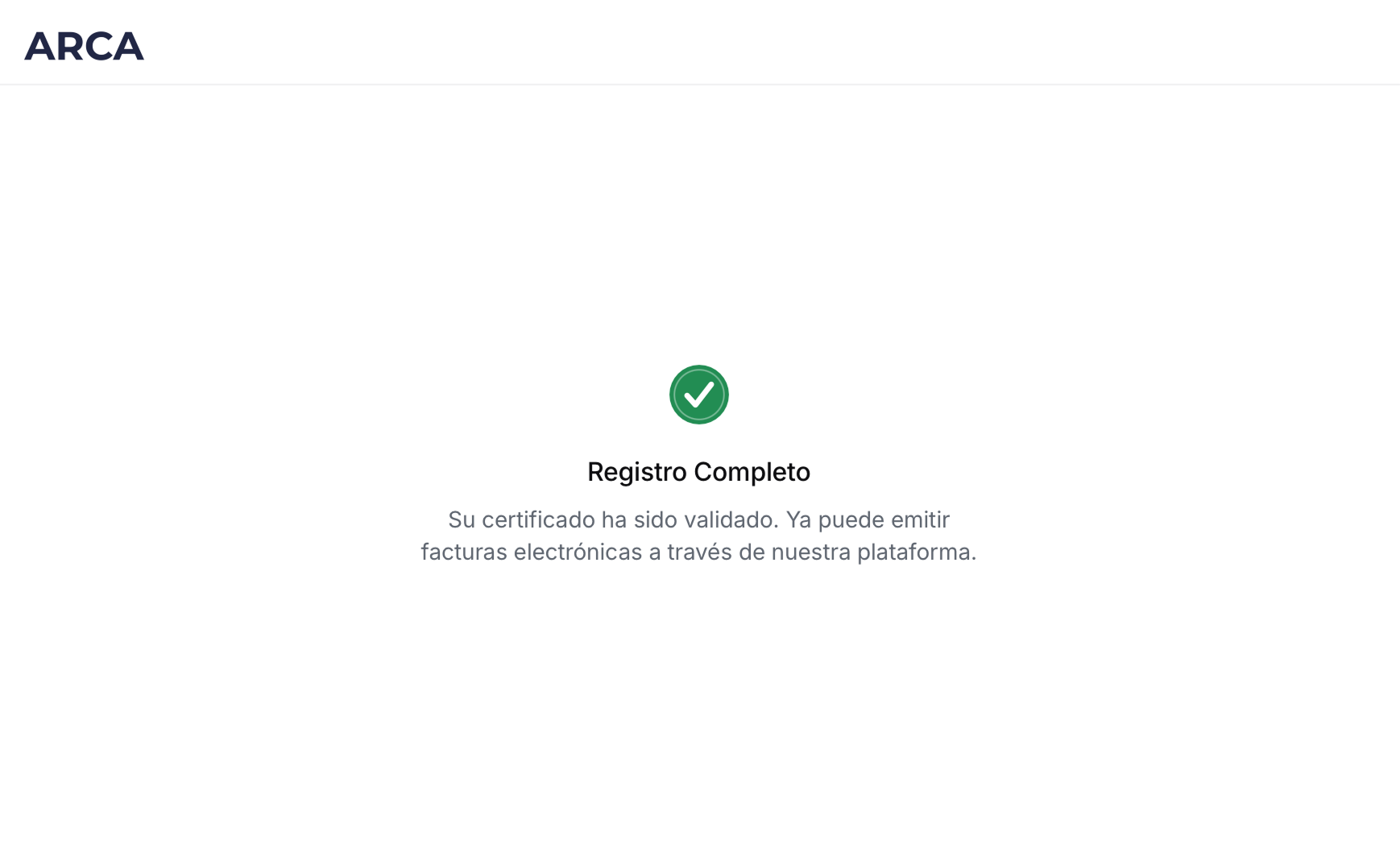 Volviendo al flujo de alta, si has realizado los pasos correctamente y pulsas Continuar, verás las pantalla de “Registro completo”. En caso de recibir un error, verifica que hayas realizado todos los pasos correctamente o contacta con soporte.