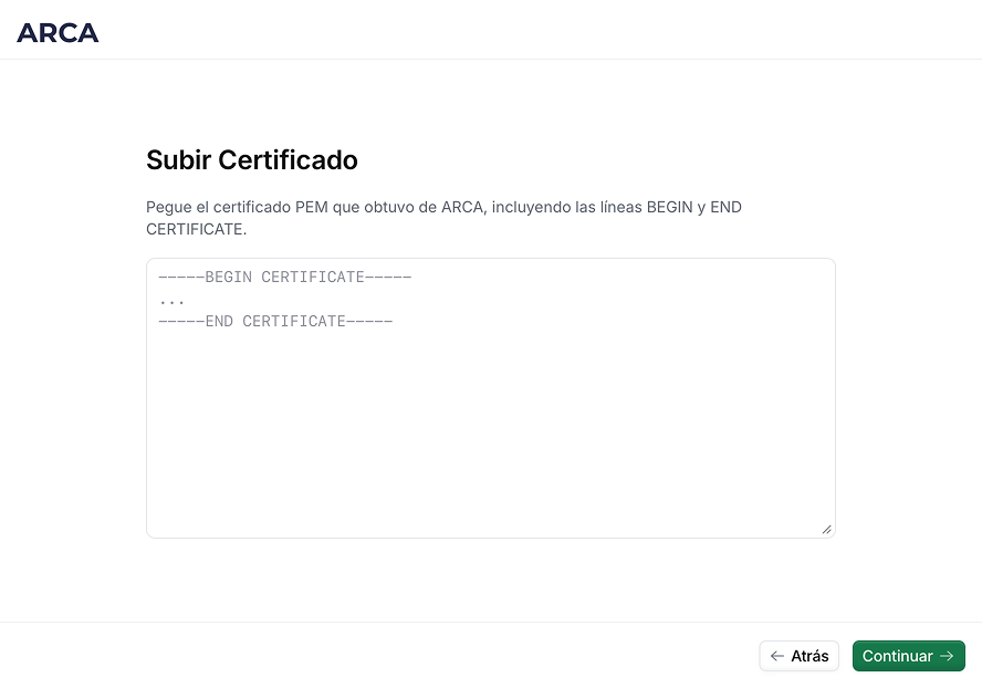 Vuelve al flujo de alta, y pega el contenido del certificado en la pantalla de “Subir Certificado”. Da click en Continuar para verificar la validez del certificado.