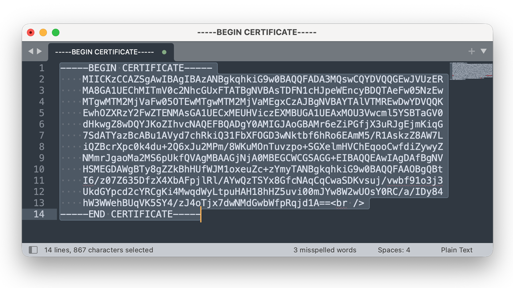 Abre el certificado que has descargado en un editor de texto y copia el contenido, incluidas las líneas de