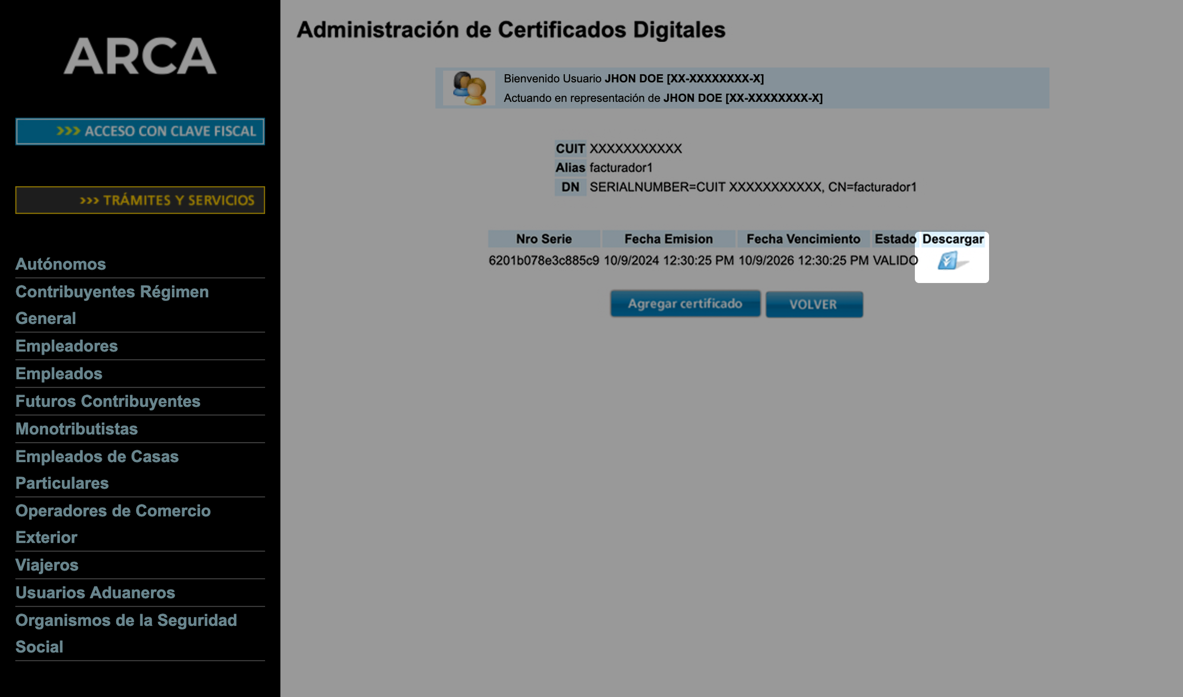 Luego descargar el certificado pulsando sobre el icono de descarga: